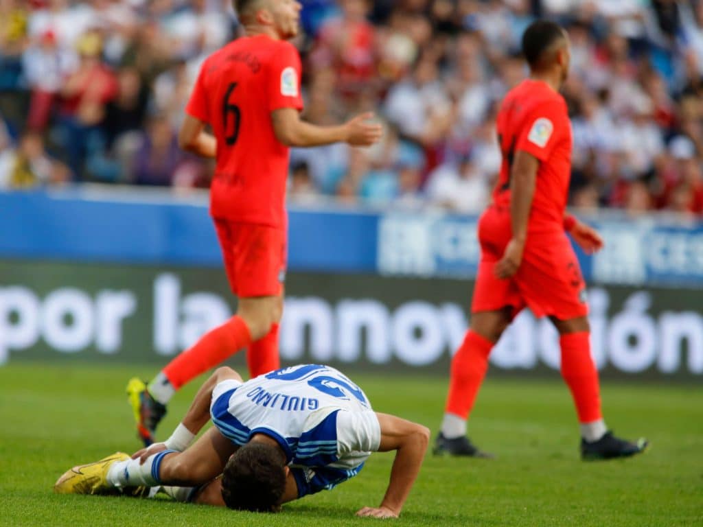 El áspero, mediocentro uruguayo Benavídez, quien ya debío haber visto una amonestación por pisar el talón de Vada nada más arrancar el choque, se excedió en una innecesaria entrada sobre Mollejo y cometió la imprudencia de clavar sus tacos en el gemelo del madrileño. El VAR avisó a Hernández Maeso antes de que el balón se pusiera en juego y éste lo expulsó tras consulta en el monitor. El Alavés apenas maniobró retrasando a Guridi en un 441 y el Real Zaragoza vivió sus mejores minutos del choque, rondando el gol ante unos locales en llamas por haberse quedado con uno menos. Con todo, apenas una pierna adelantada de Luis Rioja, en un mal repliegue defensivo, anuló un primer gol de Guridi al borde del descanso.