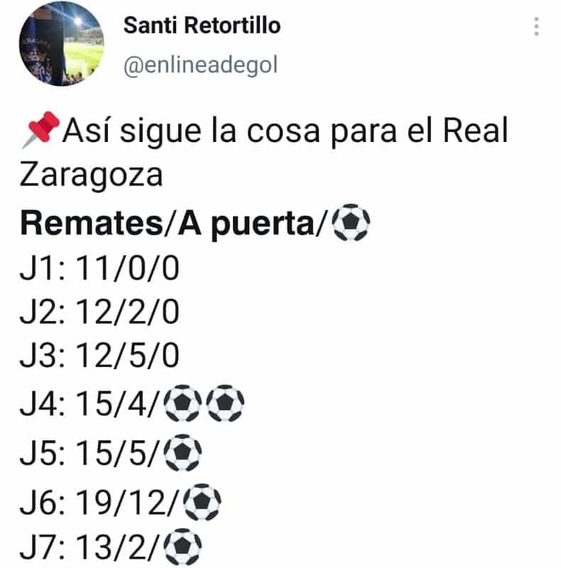 Las temporadas suelen tardar poco en depararnos paradojas, capaces incluso de rebatir las verdades más compartidas. A nadie se le escapa que a este Real Zaragoza no le sobra gol, al contrario. Sirva como ilustración este muy visual tuit de nuestro, amigo, colega y abonado -in that order- Santi Retortillo. 97 remates en siete partidos, 30 a puerta y cinco goles. Salvaje. ¿Cuál es la paradoja entonces? Que este equipo sin gol ha marcado en los últimos cuatro choques, igualando su mejor y única racha de la campaña pasada: de la jornada 28 a la 31- Todavía muchos reducen nuestro presente a ese factor, cuando otra realidad menos comentada es que se ha encajados en seis de los siete encuentros disputados: y en los seis el oponente se ha adelantado, obligándonos a vivir a remolque.
